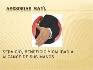 Asesorías MAYL S.A. es una empresa dedicada a prestar asesoría en trámites documentales relacionados con casos de accidentes de tránsito y la adquisición de vehículos. La empresa busca ser la referencia en el mercado en 2015 ofreciendo un servicio de calidad, eficiencia y satisfacción al cliente. Asesorías MAYL provee servicios de acompañamiento las 24 horas y tramitación de documentos de manera personalizada.