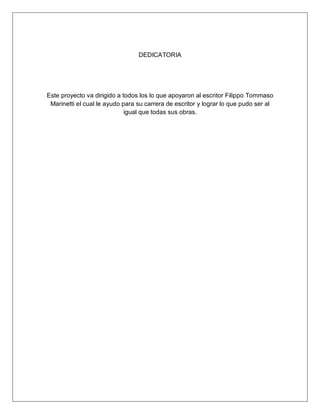 Este documento presenta información sobre el escritor y fundador del movimiento futurista Filippo Tommaso Marinetti. Incluye una biografía de Marinetti, extractos de algunos de sus poemas y el Manifiesto Futurista. También resume los principales postulados del movimiento futurista como la exaltación de la velocidad, la máquina y la guerra, y la destrucción de la sintaxis convencional.