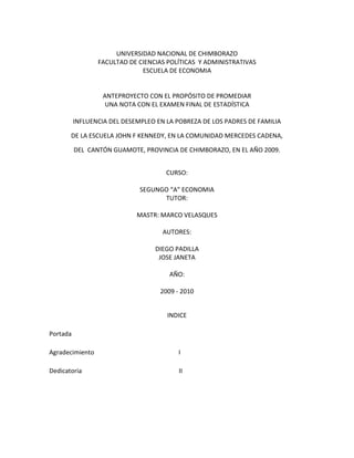 Este documento presenta un proyecto de investigación sobre el desempleo y la pobreza en la comunidad Mercedes Cadena en Guamote, Ecuador. El desempleo se define como la falta de trabajo y puede ser friccional, estructural o cíclico. Causa efectos económicos y sociales como menores ingresos y bienestar. La pobreza es la falta de ingresos para satisfacer necesidades básicas. El proyecto analiza las causas del desempleo y la pobreza en la comunidad, incluyendo falta de oportunidades laborales.