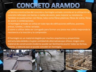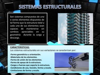 Este documento describe diferentes sistemas estructurales como muros portantes, sistemas aporticados, cerchas metálicas y concreto armado. Explica sus características principales, ventajas y desventajas. Los muros portantes transmiten cargas al terreno a través de cimentaciones. Los sistemas aporticados usan pórticos para soportar forjados. Las cerchas están compuestas de barras unidas formando una armazón rígida. El concreto armado combina hormigón y acero para lograr