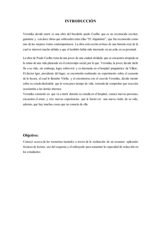 Veronika intenta suicidarse tomando pastillas para dormir, pero es encontrada inconsciente y llevada a un hospital psiquiátrico llamado Villete. Allí, los médicos le mienten y le dicen que le queda poco tiempo de vida debido a los daños en su corazón causados por la sobredosis. Veronika conoce a otros pacientes como Zedka y comienza a cuestionar su decisión inicial de suicidarse, experimentando nuevas experiencias que le muestran otras facetas de sí misma. Sin embargo, eventualmente descubre que el pron