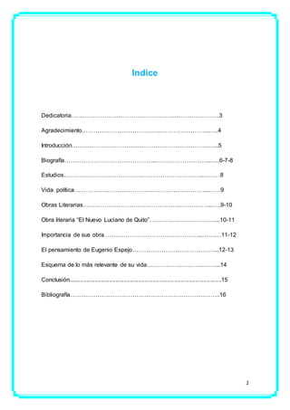 Este documento presenta la biografía de Eugenio de Santa Cruz y Espejo, un destacado médico, escritor, periodista y político ecuatoriano del siglo XVIII. Resume sus estudios en medicina, derecho y filosofía, su trabajo para prevenir la viruela, y sus importantes obras literarias como "El Nuevo Luciano de Quito" y "Cartas Riobambenses" donde criticó la sociedad quiteña colonial. Finalmente, habla de su labor como director de la primera biblioteca pública y su fallecimiento a los 48 años mientras estaba
