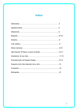 Este documento presenta una biografía de Eugenio de Santa Cruz y Espejo, un destacado personaje ecuatoriano del siglo XVIII. Resume sus estudios en medicina, derecho y leyes, y su trabajo como médico, periodista y director de la primera biblioteca pública de Quito. Detalla algunas de sus obras literarias más importantes como "El Nuevo Luciano de Quito" y "Cartas Riobambenses", en las que criticó la sociedad quiteña colonial y la estructura socioeconómica de la época. Finalmente, describe la persecuc