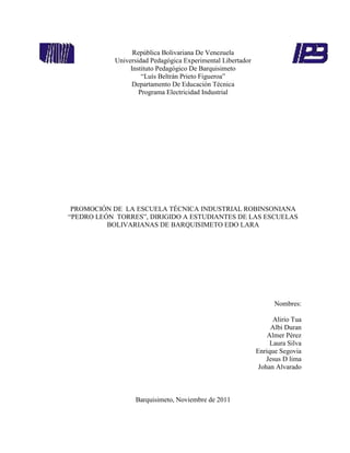 Este documento describe un plan para promover la Escuela Técnica Industrial Robinsoniana "Pedro León Torres" dirigido a estudiantes de escuelas bolivarianas en Barquisimeto, Venezuela. Recientemente, la escuela ha experimentado una disminución en la matrícula estudiantil, lo que ha dado lugar al cierre de secciones. El propósito general del plan es promover la escuela técnica entre los estudiantes de escuelas bolivarianas para aumentar la matrícula. El plan incluye objetivos específicos como diagnosticar la necesidad de promoci