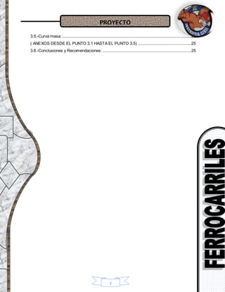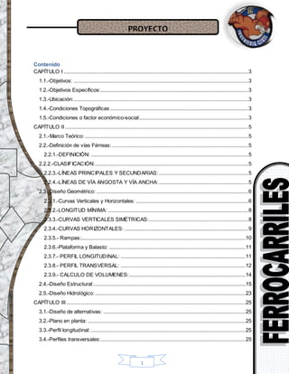 Este documento presenta el diseño de una vía férrea en la provincia de Méndez. Se describen los objetivos y ubicación del proyecto, así como las condiciones topográficas y socioeconómicas de la zona. Luego, se explican conceptos teóricos sobre ferrocarriles y se detallan aspectos del diseño geométrico y estructural, incluyendo cálculos de curvas verticales y horizontales, pendientes, perfiles y volúmenes. Finalmente, se mencionan los capítulos posteriores sobre diseño