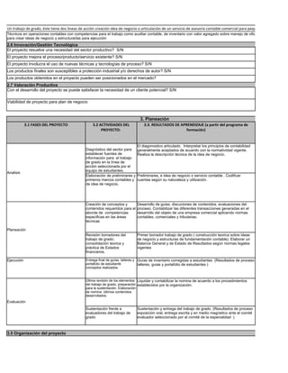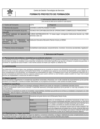 El documento presenta un proyecto de formación para estudiantes del grado décimo de la Institución Educativa Monseñor Ramón Arcila. El proyecto busca desarrollar competencias comerciales y financieras en los estudiantes a través de contenidos sobre contabilidad, inventarios, ideas de negocio y legislación laboral y comercial. El proyecto se ejecutará en 2 años con actividades de diagnóstico, análisis, planeación, ejecución y evaluación. Los resultados incluyen un trabajo de grado sobre una idea de neg