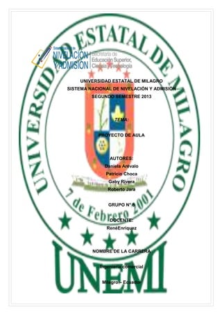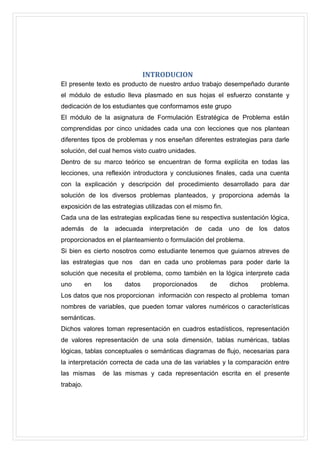 El documento presenta un proyecto de aula desarrollado por un grupo de estudiantes de ingeniería comercial sobre la asignatura de Formulación Estratégica de Problemas. El proyecto incluye una introducción, justificación, objetivos, y anexos sobre diferentes estrategias para resolver problemas como procedimientos, relaciones familiares, tablas lógicas y simulaciones. A través del proyecto, los estudiantes aprendieron a identificar variables y clasificar problemas para encontrar soluciones usando estrategias de la asignatura.