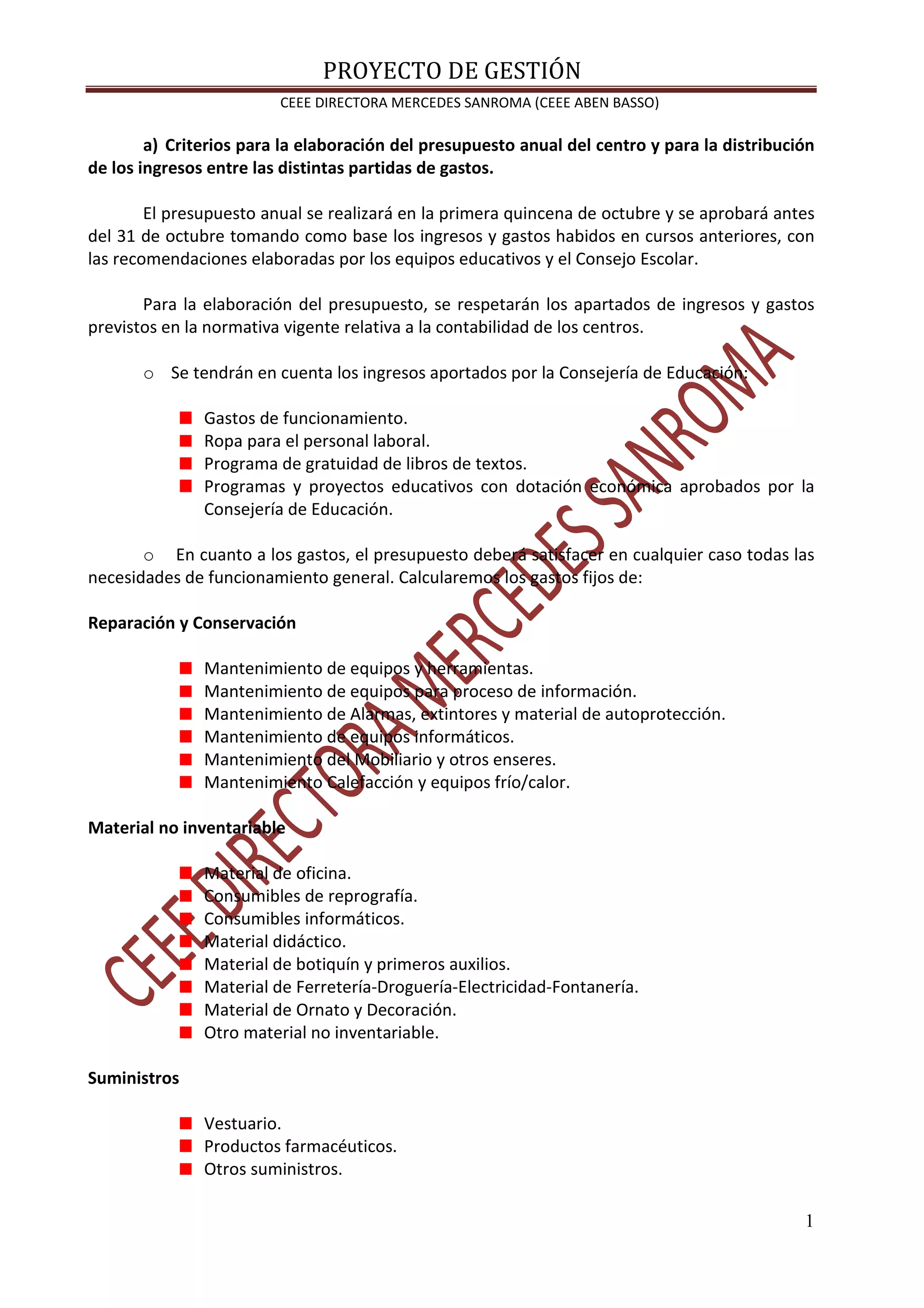 Este documento describe los criterios de gestión del centro educativo CEEE Aben Basso dirigido por Mercedes Sanroma. Incluye criterios para el presupuesto anual, la sustitución del profesorado, la conservación de las instalaciones y equipamiento, la obtención de ingresos adicionales, el inventario anual y una gestión sostenible de los recursos y residuos del centro.