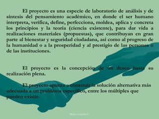 El documento presenta información sobre la concepción y elementos de un proyecto de grado. Explica que un proyecto de grado es un plan de acción que especifica el trabajo académico a realizarse en un tiempo, espacio y costo determinados. Detalla las etapas básicas de un proyecto, incluyendo la planificación, ejecución, informe y evaluación. Además, describe los elementos clave que deben incluirse en la planificación de un proyecto, como la portada, índice, resumen, introducción, marco