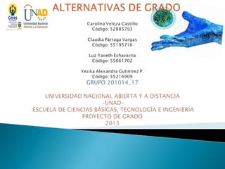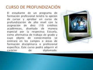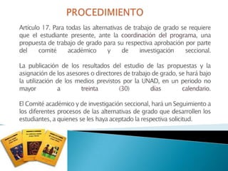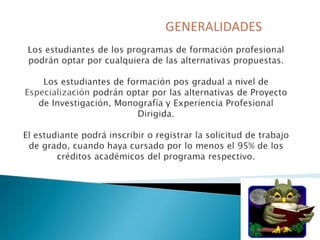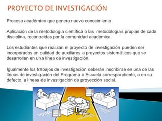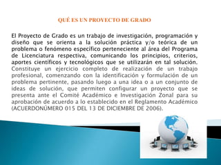El Proyecto de Grado es un trabajo de investigación o desarrollo que busca resolver un problema o fenómeno específico de un programa de licenciatura. Existen varias alternativas como proyectos aplicados, de investigación, experiencia profesional dirigida o monografías. El estudiante trabaja con un director o tutor y presenta su propuesta al Comité Académico para aprobación. Luego desarrolla, sustenta y evalúa el trabajo para optar por el título profesional.