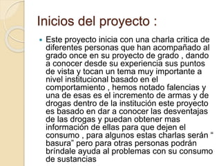 Este documento describe un proyecto escolar sobre las drogas y la adicción. El proyecto tiene como objetivo principal brindar más información a los estudiantes sobre las sustancias psicoactivas a través de charlas. El proyecto busca el apoyo de las directivas escolares para llevar a cabo las charlas y crear un espacio para discutir temas como la sexualidad y las drogas. El documento también incluye información sobre clasificaciones de drogas, efectos en el sistema nervioso, y factores que influyen en el consumo de drogas entre los