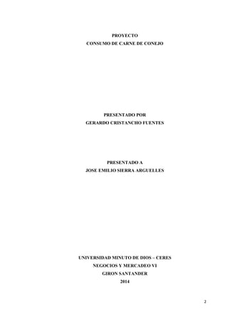 Este documento presenta un proyecto de grado sobre el consumo de carne de conejo en Bucaramanga, Colombia. El proyecto busca identificar las causas del bajo consumo de carne de conejo en la región y propone estrategias para aumentar su comercialización. Incluye una revisión de la literatura sobre cunicultura, las características nutricionales de la carne de conejo, y el marco legal para la producción y venta de esta carne en Colombia. También presenta los resultados de una encuesta realizada en Bucaramanga sobre el