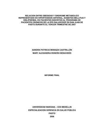 Este documento describe una investigación sobre la relación entre la obesidad y el síndrome metabólico, representado por la hipertensión arterial, la diabetes mellitus y la dislipidemia, en pacientes inscritos en un programa de atención a pacientes crónicos en San Juan de Pasto, Colombia. El estudio analiza los aspectos teóricos de la obesidad y estas enfermedades, así como la metodología empleada para analizar los resultados obtenidos en la población estudiada.