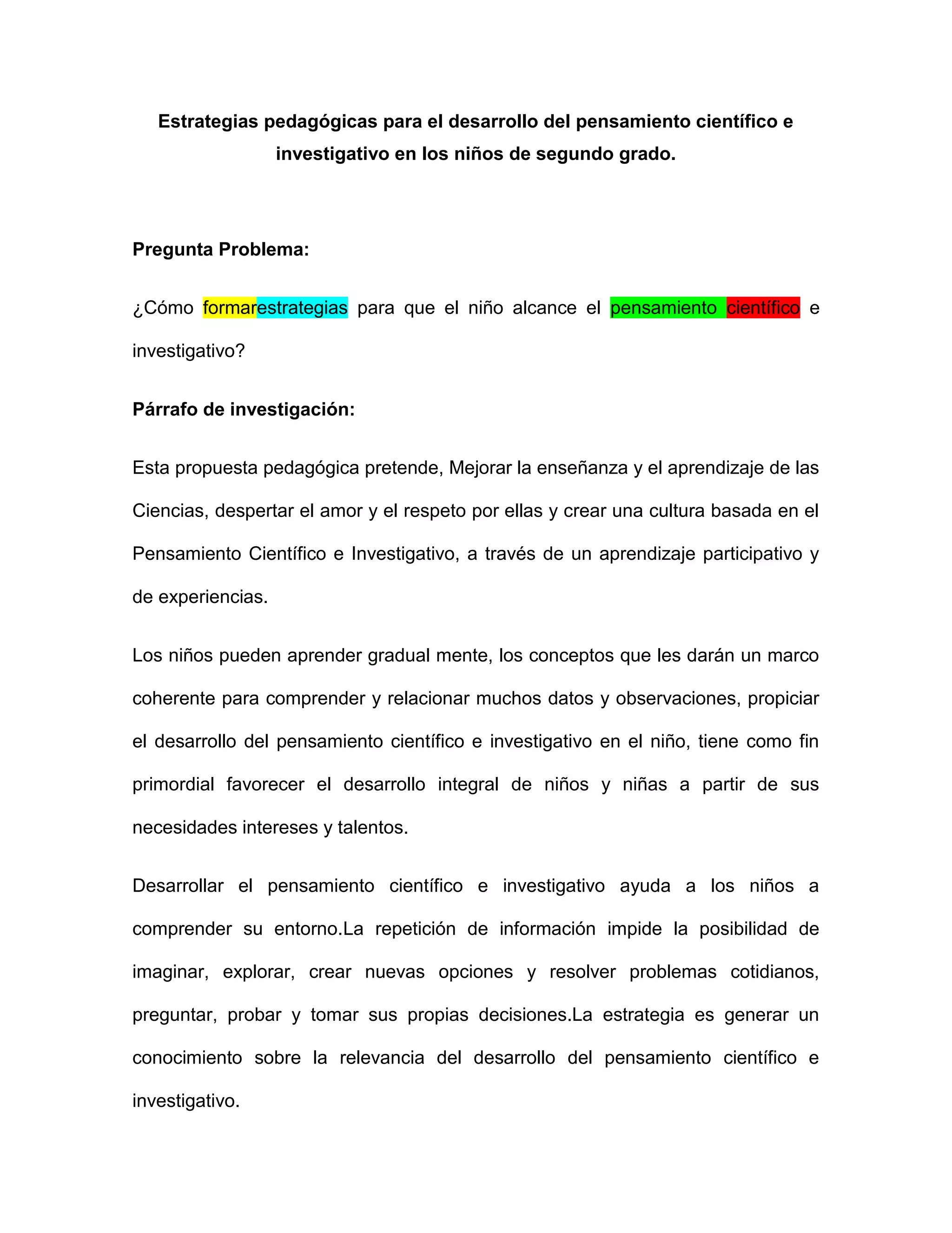 Este documento describe estrategias pedagógicas para desarrollar el pensamiento científico e investigativo en niños de segundo grado. El objetivo es mejorar la enseñanza de las ciencias mediante experiencias participativas que despierten la curiosidad de los niños. Se propone generar conocimientos sobre la importancia de este tipo de pensamiento a través de actividades que permitan a los estudiantes interpretar su entorno, formar sus propios conceptos y desarrollar habilidades de por vida.