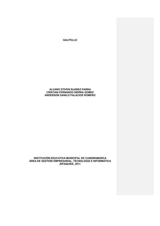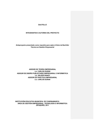 El documento presenta el anteproyecto de la empresa Galpollo. Inicialmente se muestran los integrantes del proyecto y las instituciones que lo avalan. Luego se presenta una lluvia de ideas de negocio, con 20 opciones que son valoradas por cada socio. Finalmente se selecciona la producción y venta de pollos como la idea de negocio, debido a que satisface una necesidad básica y es viable en la ciudad de Zipaquirá.