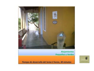 Este documento presenta un proyecto sobre hoteles pequeños y verdes. El proyecto incluye objetivos como explicar varios alojamientos sostenibles en el mundo y motivar a los estudiantes a investigar este tipo de hoteles de manera virtual. El documento también describe estrategias de enseñanza como el uso de analogías y videos para facilitar la comprensión de los contenidos sobre hoteles sostenibles.