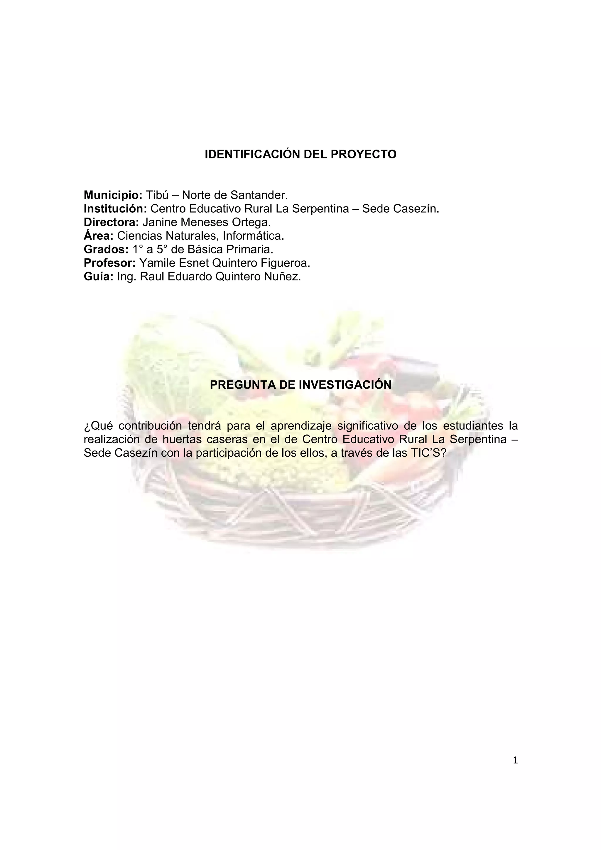 El documento presenta un proyecto de investigación sobre la implementación de huertas caseras en el Centro Educativo Rural La Serpentina en Tibú, Norte de Santander, Colombia. El proyecto busca mejorar el aprendizaje de los estudiantes y fomentar las buenas relaciones entre padres e hijos a través de la creación de estas huertas con la participación de los estudiantes y el uso de las TIC.