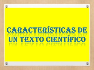 El documento describe las características de los textos y artículos científicos. Explica que los textos científicos se basan en un lenguaje científico objetivo, verificable y preciso para comunicar enunciados coherentes. Los artículos científicos presentan los resultados de una investigación de manera clara y sintética, siguiendo un formato estandar con introducción, métodos, resultados y discusión.