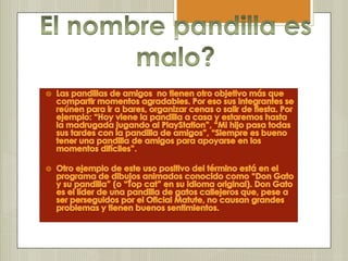 Las pandillas en la adolescencia suelen estar compuestas por adolescentes o jóvenes con problemas de conducta y malas relaciones familiares. Buscan reconocimiento y sentido de pertenencia uniéndose a grupos que a menudo realizan actividades ilegales como el narcotráfico o el robo. En América Latina, el término pandilla suele referirse a bandas urbanas violentas que siembran el terror en los territorios que dominan.