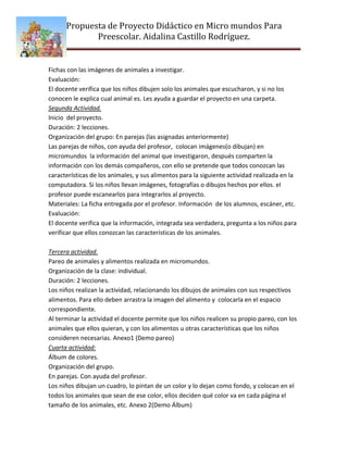 Este documento presenta una propuesta de proyecto didáctico en Micro mundos para preescolar sobre los animales de la tierra. El proyecto tiene como objetivos que los niños reconozcan sonidos de animales, conozcan sus alimentos y la importancia de los animales. Incluye cinco actividades como discriminación auditiva, creación de información sobre animales en Micro mundos, pareo de animales con alimentos, álbum de colores y conclusión del proyecto jugando con sonidos y movimientos de animales.