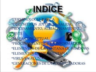 El documento abarca varios aspectos fundamentales de la informática, incluyendo terminología básica, hardware, software, y la evolución de las computadoras a través de diferentes generaciones. Detalla las funciones de los dispositivos de entrada y salida, así como la naturaleza de los virus informáticos y los métodos de detección y eliminación de estos. También se discuten los sistemas de almacenamiento y el papel de las tecnologías de la información y la comunicación (TIC) en el procesamiento y gestión de datos.
