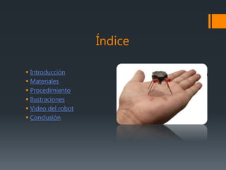 El documento describe un proyecto de un robot mosquito casero realizado por un grupo de estudiantes, explicando los materiales y el procedimiento para su construcción. El objetivo es divertir a los observadores mediante el movimiento del robot, que simula el desplazamiento de un mosquito. Al final, se destaca el aprendizaje sobre tecnología y el uso de materiales simples del hogar.