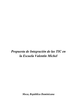 La propuesta busca integrar las TIC en la gestión y enseñanza de la Escuela Valentín Michel en República Dominicana para mejorar el proceso de enseñanza-aprendizaje. Se propone capacitar a maestros y personal en el uso de herramientas TIC, automatizar procesos administrativos, y realizar actividades con estudiantes usando software educativo y la web. El objetivo es optimizar los recursos tecnológicos disponibles como computadoras, data show y equipo de audio para enriquecer las actividades educativas.