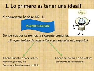 Este documento ofrece instrucciones para desarrollar un proyecto en varias etapas. Primero, se debe definir el ámbito del proyecto (social, educativo). Luego, se explican los pasos para realizar el proyecto, incluyendo introducción, justificación, análisis de la realidad, contexto, destinatarios, objetivos, metodología, temporalización, recursos, presupuesto y evaluación. El documento proporciona consejos para cada etapa y herramientas para analizar la realidad del proyecto.