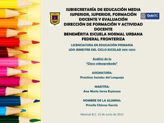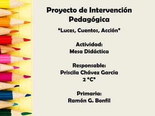 La alumna Priscila Chávez García aplicó un proyecto pedagógico llamado "Luces, Cuentos, Acción" en un grupo de 2do grado con 29 alumnos. El proyecto consistió en contar un cuento y realizar una actividad de mesa didáctica. Si bien los objetivos se lograron, hubo dificultades para mantener el orden y control del grupo. La alumna identificó áreas de oportunidad para mejorar la organización y ejecución de actividades similares en el futuro.
