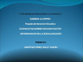 Este documento presenta un proyecto de intervención educativa sobre conductas agresivas como factor determinante en la socialización de niños en un jardín de niños. Describe el contexto y objetivos de la escuela, identifica la agresividad de algunos niños como problema a abordar, y propone una intervención psicopedagógica que incluye actividades para fomentar valores y desarrollo socioemocional con participación de maestros, familias y comunidad escolar.