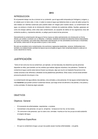 El documento trata sobre la contaminación del agua. Explica que el agua puede contaminarse a través de la introducción directa o indirecta de sustancias sólidas, líquidas o gaseosas. Luego detalla las principales fuentes de contaminación como la agricultura, industrias y desechos sanitarios. Finalmente, concluye que es importante concientizar a la población para cuidar el agua ya que es un recurso renovable en peligro debido a la actividad humana.