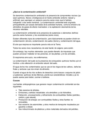Este documento describe la contaminación ambiental y sus principales causas. Explica que la contaminación ambiental incluye la contaminación del aire, suelo y agua, y que está causada principalmente por la actividad humana como la quema de combustibles fósiles y la deforestación. También identifica algunos de los mayores problemas ambientales globales como el cambio climático, la contaminación del aire, la pérdida de biodiversidad y la contaminación por plásticos. Finalmente, analiza el impacto de los residuos sólidos en la ciudad de Cali, Colombia y