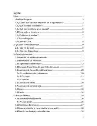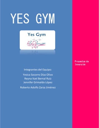 Este documento presenta un proyecto para abrir un gimnasio llamado YES GYM en Zinacantepec, Estado de México. El proyecto busca resolver el problema de la obesidad en la comunidad mediante la promoción del ejercicio físico. Se realizó un estudio de mercado que identificó la necesidad de un gimnasio accesible y una demanda potencial de 25,000 personas entre 15-45 años. El proyecto tendrá equipos de ejercicio, clases grupales y programas personalizados con el objetivo de mejorar la salud