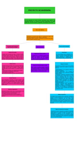 Este documento describe las etapas del ciclo de vida de un proyecto de inversión. Explica que un proyecto de inversión tiene cuatro estudios principales: estudio de mercado, estudio técnico, estudio financiero y estudio de organización. También describe las etapas de un proyecto, incluyendo la preinversión, la inversión, la operación y la evaluación de resultados. Finalmente, distingue entre proyectos de inversión privados y proyectos de inversión públicos o sociales.