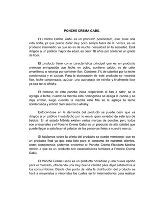 El documento describe un informe técnico sobre el Ponche Crema Gabú, un producto cremoso enriquecido con leche en polvo que contiene licor. Explica el proceso de producción, que incluye cocinar la leche, agregar vainilla, nuez moscada, leche condensada y ron, y luego licuar y envasar la mezcla. También analiza la capacidad de producción, materias primas, costos y distribución del producto.