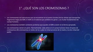 Los cromosomas son estructuras en el núcleo de las células que contienen ADN. Normalmente, cada célula humana tiene 23 pares de cromosomas (46 en total), que transportan genes de la madre y el padre. Los cromosomas están compuestos de ADN enrollado y proteínas, y su estructura incluye dos cromátidas unidas por un centrómero.