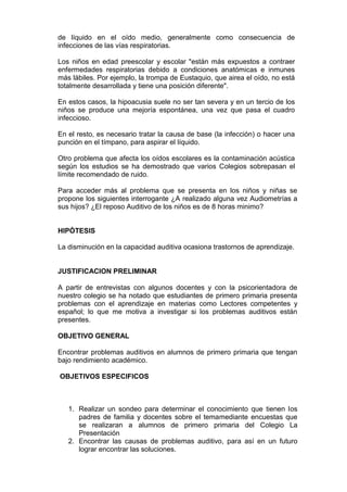 Este documento describe un proyecto de investigación sobre los posibles problemas auditivos que están causando bajo rendimiento académico en estudiantes de primer grado en un colegio. El proyecto examinará a 20 estudiantes con los 10 puntajes más bajos mediante audiometrías realizadas por un especialista. El objetivo es determinar si los problemas auditivos, como consecuencia de infecciones u otras causas, están afectando la comprensión y el desarrollo lingüístico de los estudiantes.