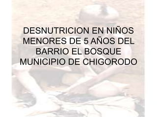 Este documento describe un proyecto de investigación sobre la desnutrición en niños menores de 5 años en el barrio El Bosque en el municipio de Chigorodo. El proyecto busca identificar las principales causas de desnutrición en la zona e implementar estrategias para abordar este problema de salud pública, con el objetivo de mejorar el desarrollo y crecimiento de los niños. El proyecto también tiene como objetivo desarrollar alternativas comunitarias de complementación alimentaria y un sistema de vigilancia nutricional.