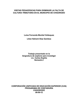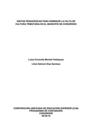 Este documento describe un proyecto de investigación que busca disminuir la falta de cultura tributaria en el municipio de Chigorodó a través de visitas pedagógicas. El proyecto tiene como objetivos identificar las reformas tributarias nacionales desde 1991, conocer los acuerdos municipales sobre recaudo de impuestos, desarrollar actividades de sensibilización sobre el pago de impuestos municipales, e implementar estrategias para aumentar el recaudo tributario municipal.