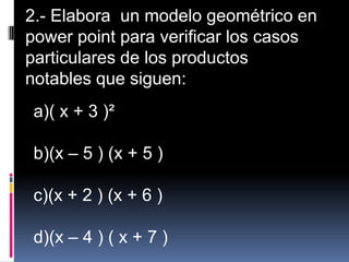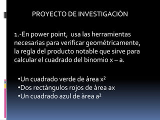 El documento propone dos proyectos de investigación en PowerPoint. El primero consiste en crear un modelo geométrico para verificar la fórmula del cuadrado del binomio x - a usando cuadrados y rectángulos de diferentes áreas. El segundo proyecto implica elaborar modelos geométricos adicionales para verificar fórmulas de productos notables como (x + 3)2, (x - 5)(x + 5), (x + 2)(x + 6) y (x - 4)(x + 7).