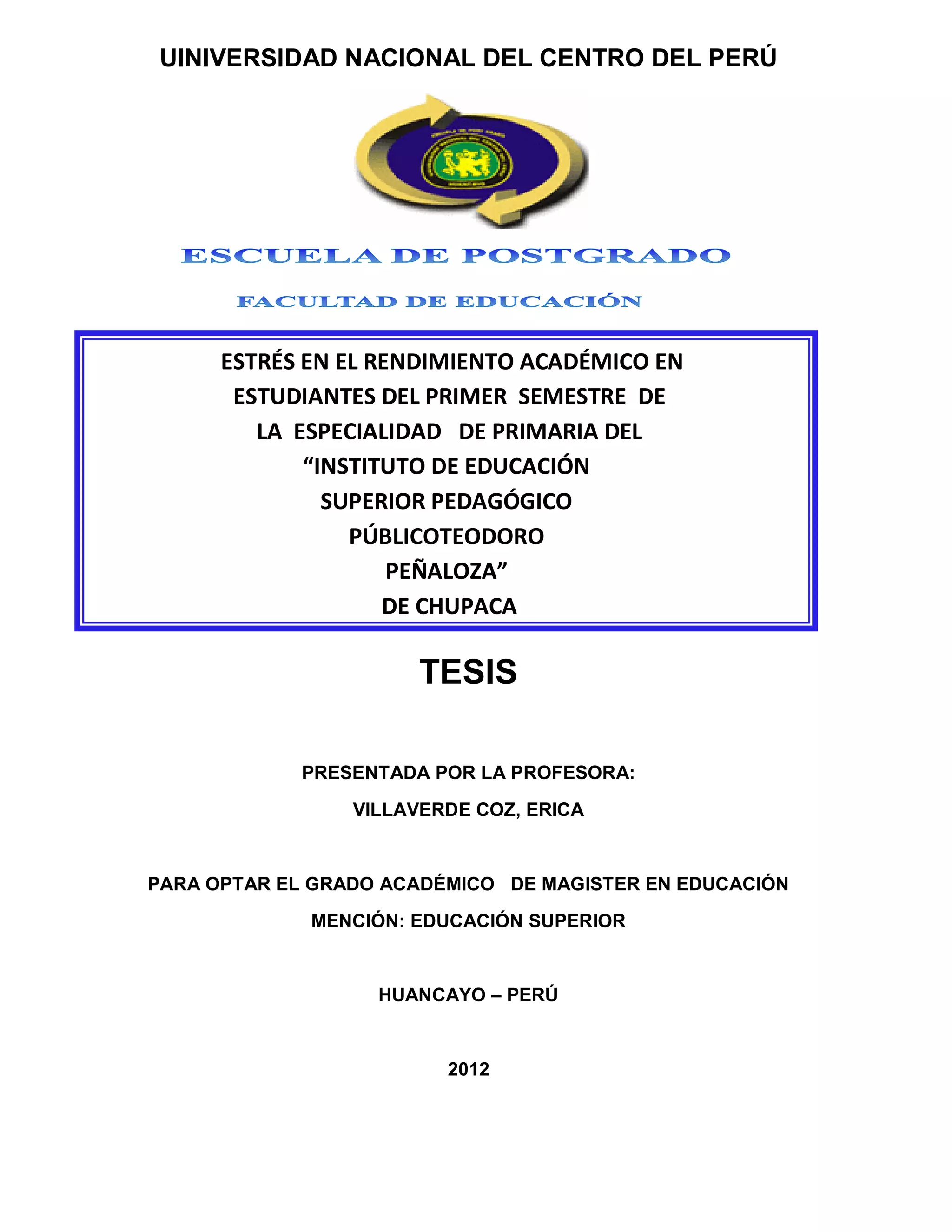 Este documento presenta una tesis sobre cómo el estrés influye en el rendimiento académico de estudiantes del primer semestre de la especialidad de primaria del Instituto de Educación Superior Pedagógico Público Teodoro Peñaloza de Chupaca, Perú. La autora busca determinar cómo el estrés afecta el rendimiento académico de los estudiantes a través de sesiones sobre el estrés, evaluaciones del nivel de estrés y técnicas para controlar el estrés. El documento revisa literatura sobre el estrés