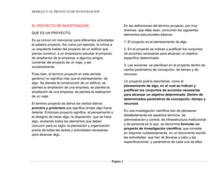 Un proyecto de investigación consiste en planear cuidadosamente los aspectos técnicos, administrativos e infraestructurales de un estudio a través de un documento escrito. Este documento debe especificar el problema de investigación, los objetivos, la metodología, el cronograma de actividades y el presupuesto para guiar la toma de decisiones y el desarrollo del proyecto. Los elementos clave de un proyecto de investigación incluyen la justificación del tema, los objetivos, la metodología, el cronograma y los recursos requeridos