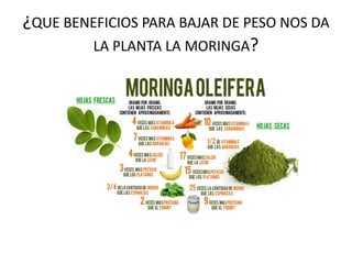 Este documento explora los beneficios de la planta Moringa oleífera, también conocida como moringa, para ayudar a bajar de peso. La moringa contiene glucosinolatos y vitaminas del grupo B que aceleran el metabolismo y ayudan a quemar calorías sin almacenar grasa. Históricamente, la moringa ha sido valorada en el antiguo Egipto, Roma y la India por sus propiedades nutritivas. Para bajar de peso con moringa, se recomienda consumir sus hojas crudas