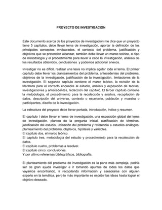 Este documento proporciona orientación sobre cómo elaborar un proyecto de investigación. Explica que un proyecto típicamente consta de 5 capítulos que cubren la introducción, marco teórico, metodología, análisis y conclusiones. Detalla los componentes clave de cada capítulo, como el planteamiento del problema, objetivos e hipótesis en el primer capítulo. También discute los tipos de tesis y ofrece consejos prácticos como seguir normas de citación y revisar el formato. El propósito general es servir