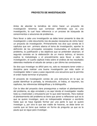 Este documento proporciona instrucciones para realizar un proyecto de investigación, incluyendo que consta de 5 capítulos y una estructura definida. Explica la importancia de definir claramente el tema de investigación, los objetivos y la metodología. También presenta reglas para seleccionar un tema adecuado y tipos de tesis, como panorámica, monográfica e histórica. El documento concluye que siguiendo un orden y la sistematización adecuada, una investigación puede profundizarse seg