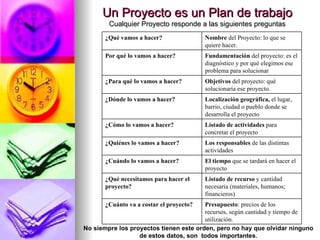 El documento proporciona información sobre cómo diseñar un proyecto de manera efectiva. Explica que un proyecto debe responder preguntas clave como el presupuesto, recursos, tiempo, responsables, actividades, ubicación, objetivos y fundamentación. También describe los pasos del método científico para la investigación de proyectos, incluida la observación, preguntas, hipótesis, investigación, y conclusión. Además, brinda ejemplos de diferentes tipos de proyectos y consejos para la selección de temas.