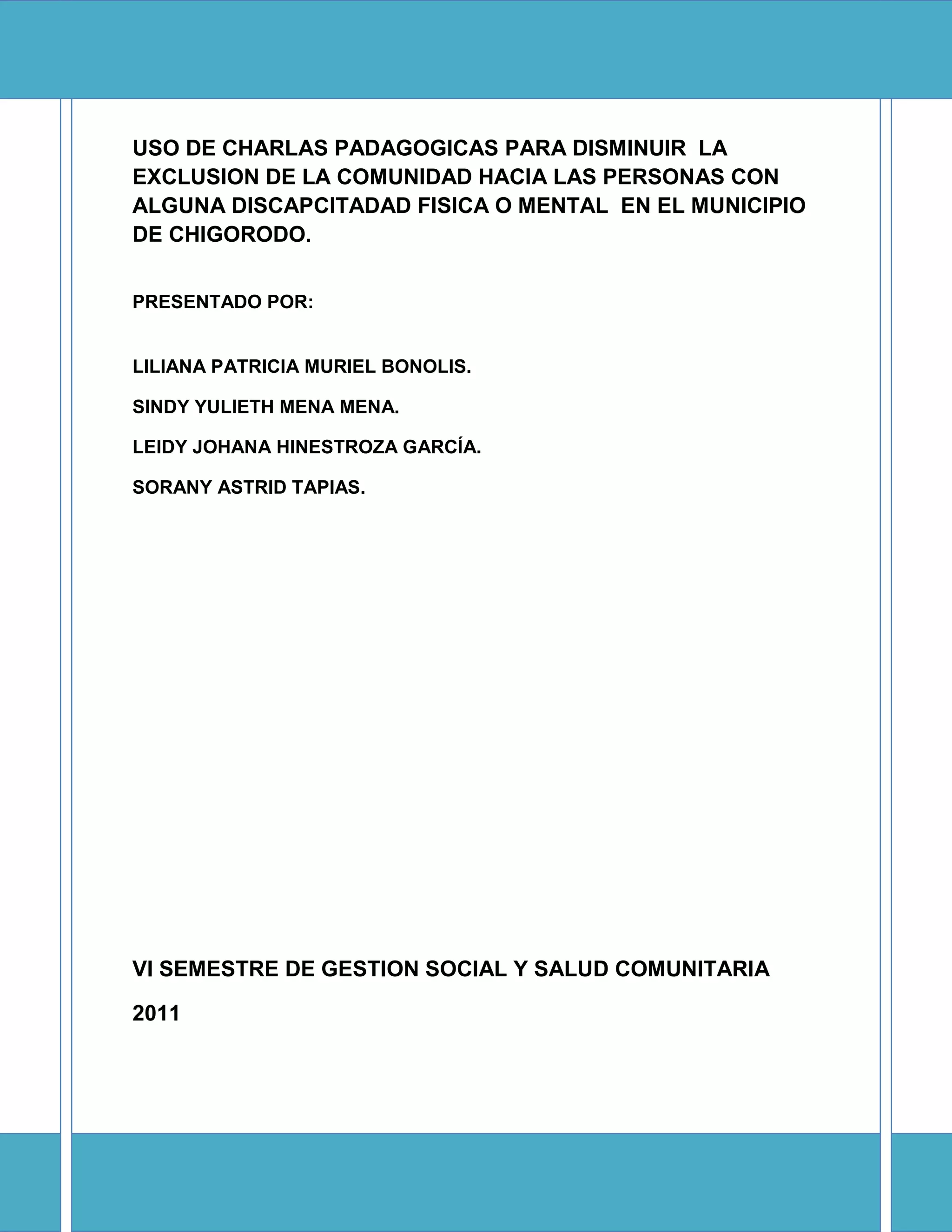 Este documento presenta un proyecto para disminuir la exclusión de la comunidad hacia las personas con discapacidad física o mental en el municipio de Chigorodo, Colombia mediante el uso de charlas pedagógicas. El proyecto busca crear conciencia en la comunidad para apoyar a las personas con discapacidad y mejorar su calidad de vida. Se realizará un estudio de la problemática que enfrentan las personas con discapacidad y se implementarán acciones para solucionarla, incluyendo charlas pedagógicas a la comunidad sobre