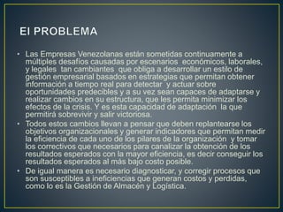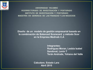 Este documento describe un proyecto de investigación que busca diseñar un modelo de gestión empresarial basado en la combinación del Balanced Scorecard y el método SCOR para la empresa Mediveb C.A. El objetivo general es desarrollar indicadores clave de desempeño para cada perspectiva de los modelos propuestos y mejorar los procesos identificados. Se revisarán conceptos organizacionales y libros sobre ambos métodos para llevar a cabo un estudio descriptivo no experimental de la empresa.