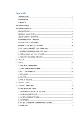 Internet es una red global de ordenadores que permite compartir e intercambiar información. El documento explica los orígenes de Internet, cómo funciona a través de redes interconectadas, los modos de acceso como la red telefónica y ADSL, y las características como ser universal, fácil de usar, variada y económica. También describe conceptos como protocolos, direcciones IP, dominios y los actores clave de Internet como proveedores y navegadores.