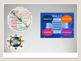 El documento habla sobre la Web 2.0, que se refiere a aplicaciones en la web que facilitan la interacción y compartir información entre usuarios, como redes sociales, wikis y blogs. Describe algunas tecnologías clave como RSS y CMS que permiten publicar y compartir contenido fácilmente. También menciona a Wikipedia como el máximo ejemplo de la Web 2.0, donde los voluntarios editan conjuntamente los artículos.